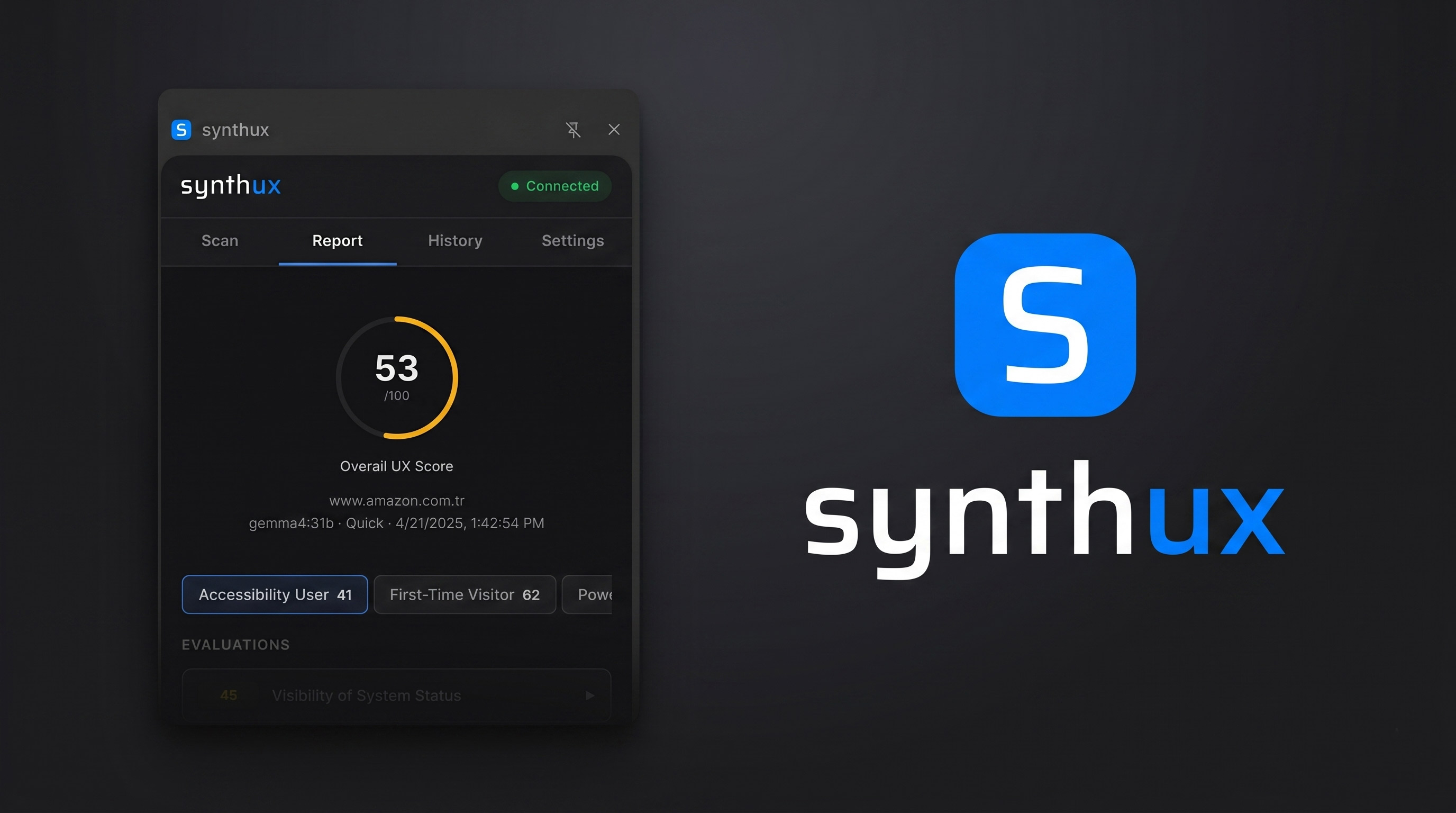synthux is an open-source Chrome extension that analyzes web pages using artificial intelligence. Based on Nielsen's 10 Usability Heuristics framework, it scores each page from 0 to 100 and provides actionable improvement recommendations.